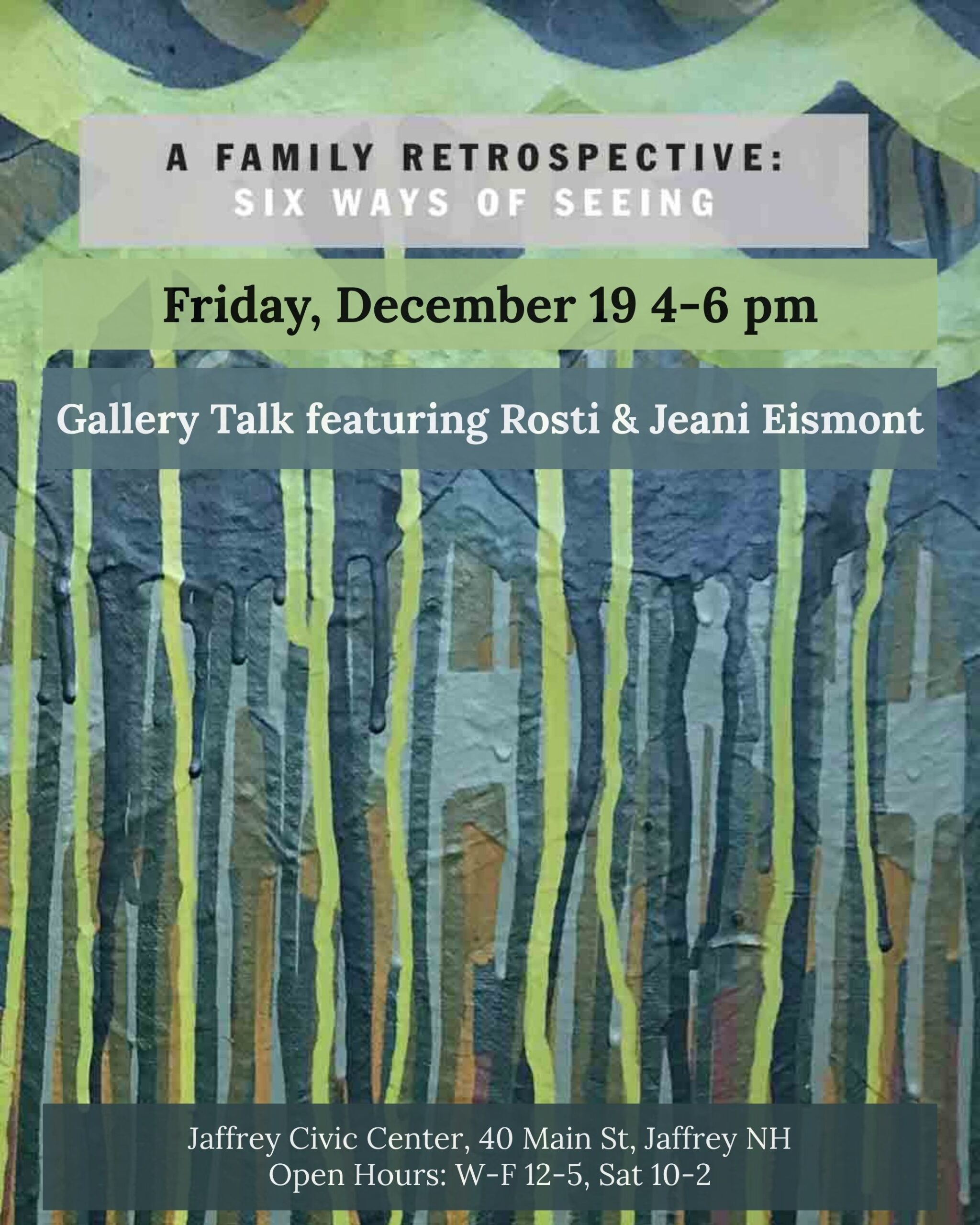 The Jaffrey Civic Center is pleased to announce a special gallery talk with Rosti and Jeani Eismont. EVENT DATE: December 19, from 4:00 to 6:00 p.m. in the upstairs Cunningham […] |
