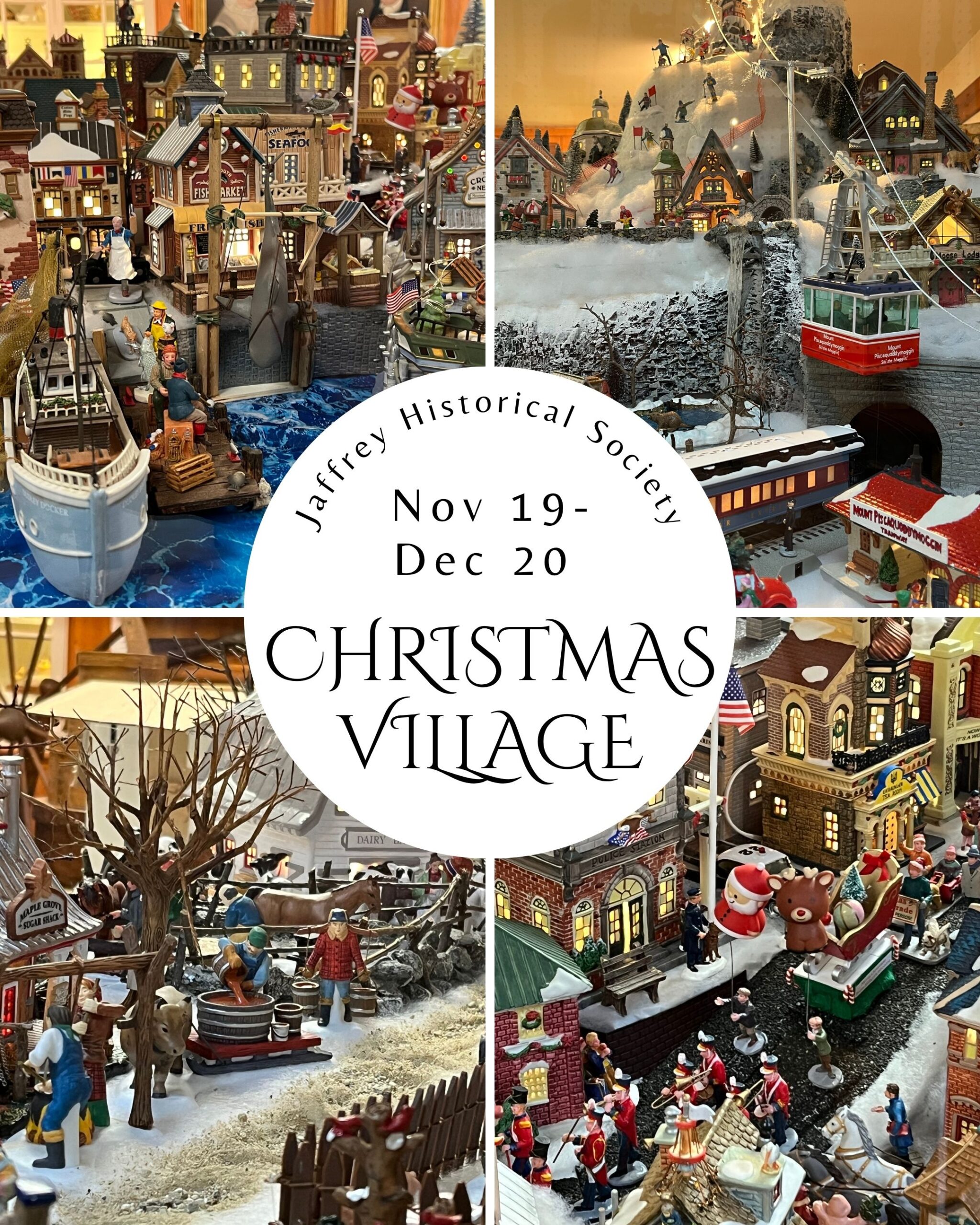 Come and see this over the top Christmas Village presented by Peter Lambert here at the Jaffrey Civic Center.  There is so much to see! A lively village with a running train, skaters, ski slope an so much more.  This exhibit is featured on the second floor Cunningham Gallery with elevator access until December 20th.  Make sure you set aside some time and bring the whole family!